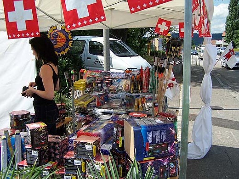 Hier wurde vor allen Dingen Weco-Ware dargeboten. Von aus Deutschland bekannten Römischen Lichtern (Knattergewitter) über das gesamte Exportprogramm (Batterien, Raketen) bis hin zum riesigen Komplettfeuerwerk war auch hier viel zu bestaunen. Im Gespräch mit einem Verkäufer erfuhr ich auch, dass sehr viele Touristen aus Deutschland die Gelegenheit des Nationalfeiertages nutzen und diesen Tag in der Schweiz verbringen... und natürlich feiern und Feuerwerk abbrennen.