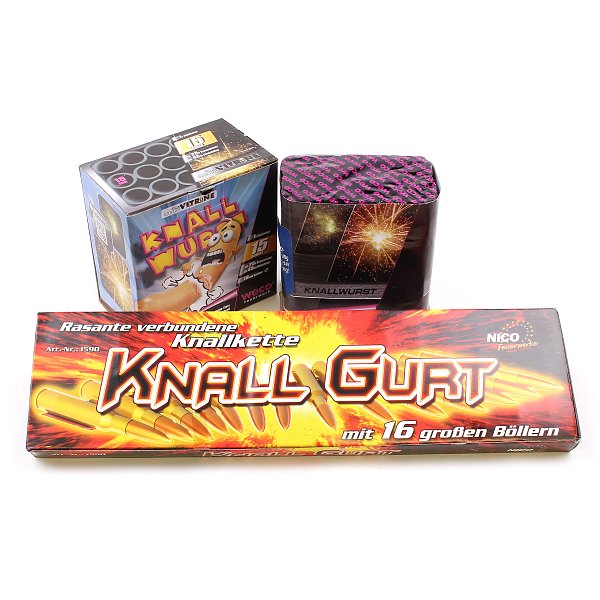 Unser zweites Premium-Gratis-Angebot umfasst die Knallwurst aus der Feuerwerksvitrinen-Serie – eine 15 Schussbatterie, den Klassiker Alligator – und eine 16er D-Böller Knallkette von Nico!