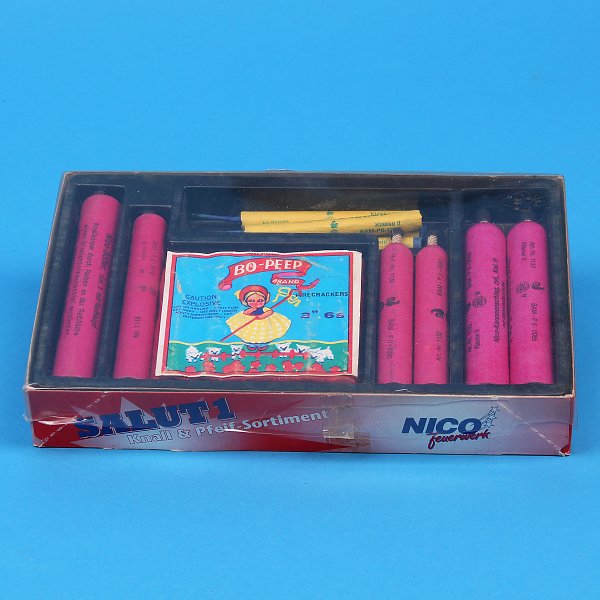 Besondere Ausführung des alten Moog-Nico Sortiment "Salut 1", die Reibböller tragen noch das Hersteller-Kürzel M, welches bei älteren Kanonenschlägen für Wuppertal steht, später gabs dann das Kürzel Wu und dem bekannten Piepenbrock-Logo.