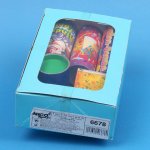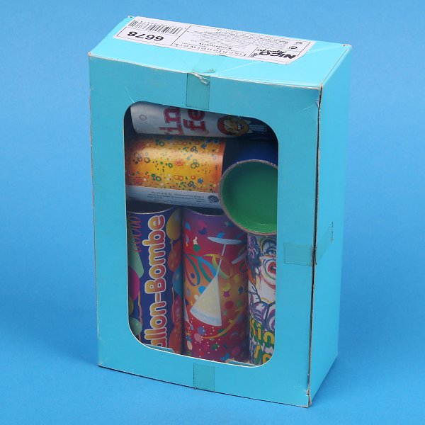 Tolle Box mit teils seltenen und schönen Tischbomben. Natürlich sind alle noch aus Made in Germany (Harz). Na das passt ja, da waren wir gerade im April 2026. Hier also ein schöber B. Zylinder, eine Kinderspaß Tibo, die Konfetti-Bombe und je einem Ballon- und Silvester(?) – Tischknaller?