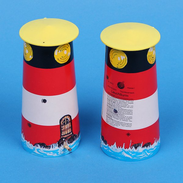 Eine echte Besonderheit. Der Leuchtturm von Silberhütte, hergestellt von Zaphiroff. Das Besondere hier ist, dass die konische Form keinen klassischen Verschuss eines Tischfeuerwerks gewährleisten kann. Der Hebedeckel könnte hier von der Stärke her nicht oben austreten, daher ist der Deckel innen perforiert. Die ausstoßende Flamme feuert also durch die Perforierung und hebt so den nicht entflammbaren Inhalt (Plastik-Spielzeug) aus dem Leuchturm heraus.